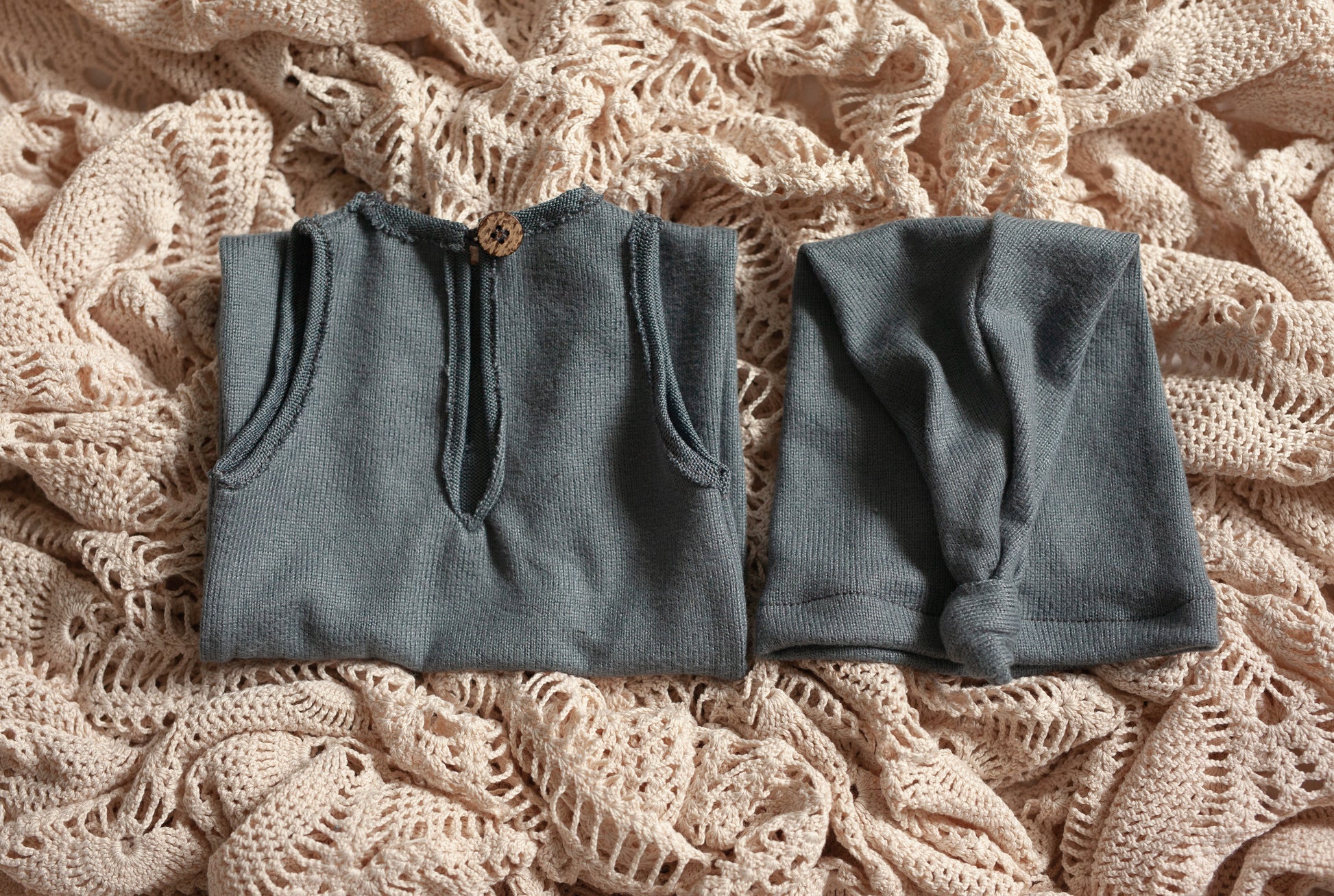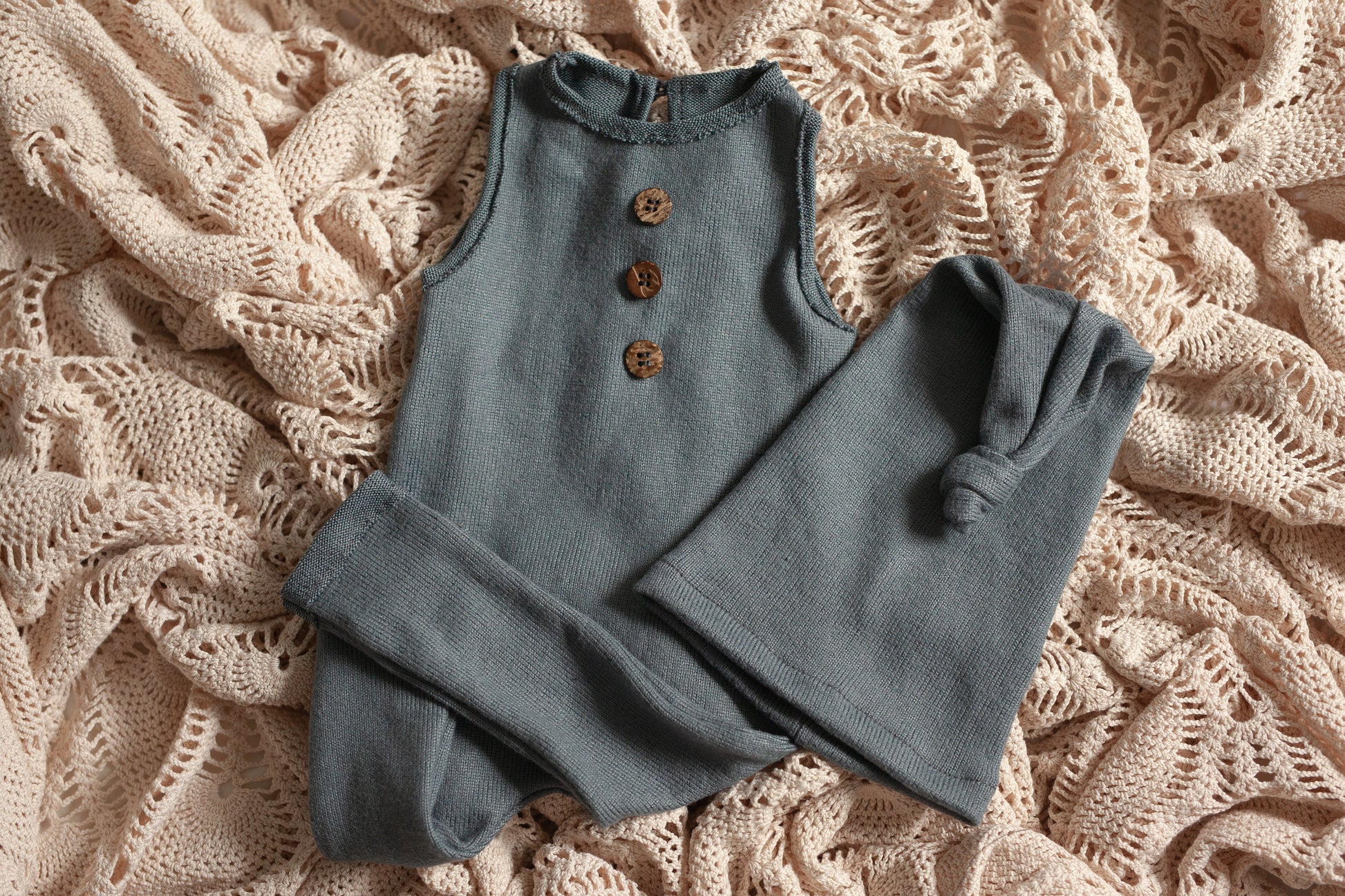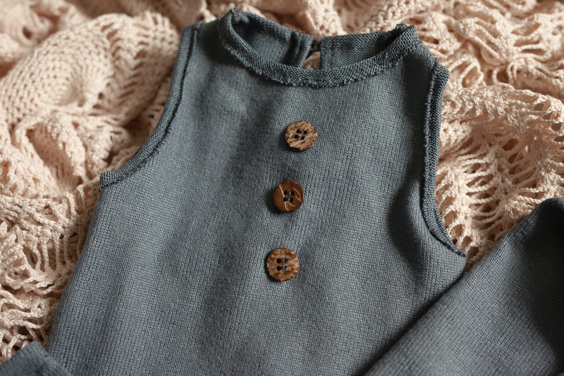 Newborn footless, sleeveless romper with rustic edging and charming wooden buttons in a grey-blue hue.