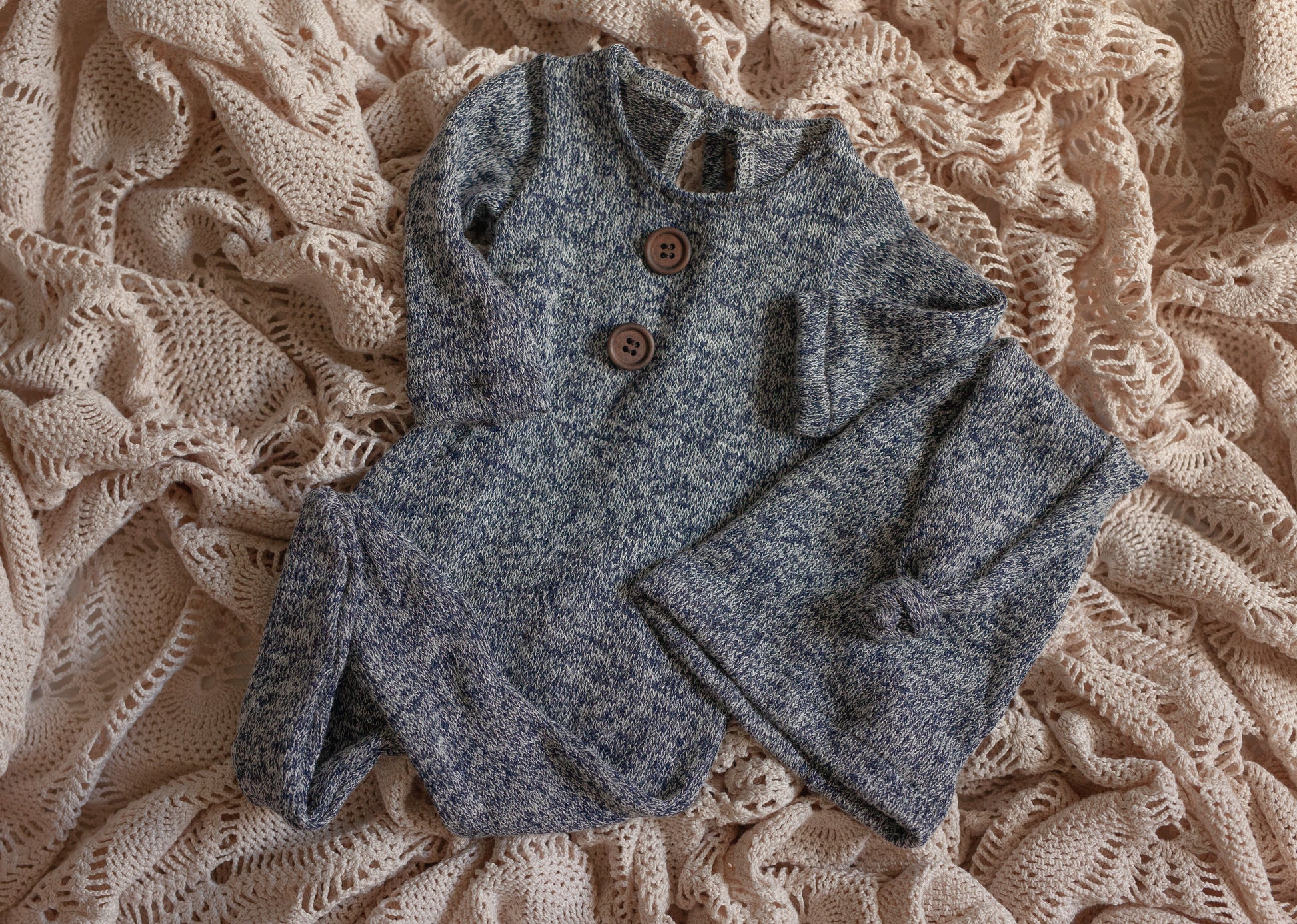 An ultra stretchy newborn footed sleeper with wooden buttons on the front, and a matching newborn sleepy cap. Please note that button styles may vary from the ones shown.