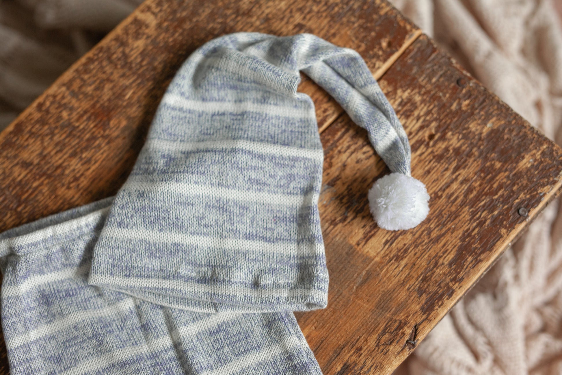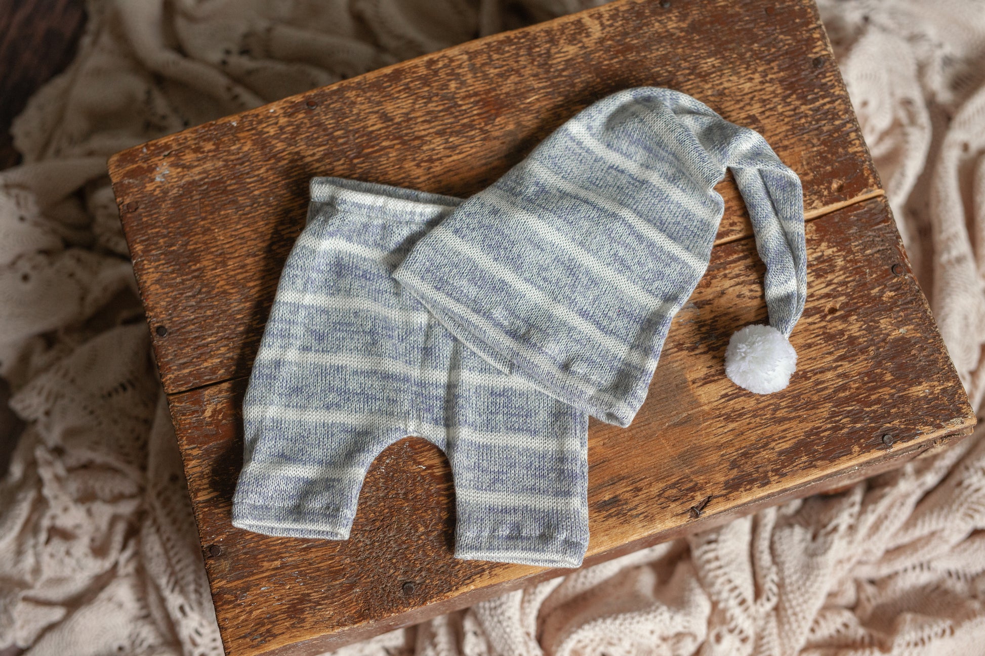 Muted blue striped shorties, and a comfy knotted cap with a darling pompom! Fits newborn.