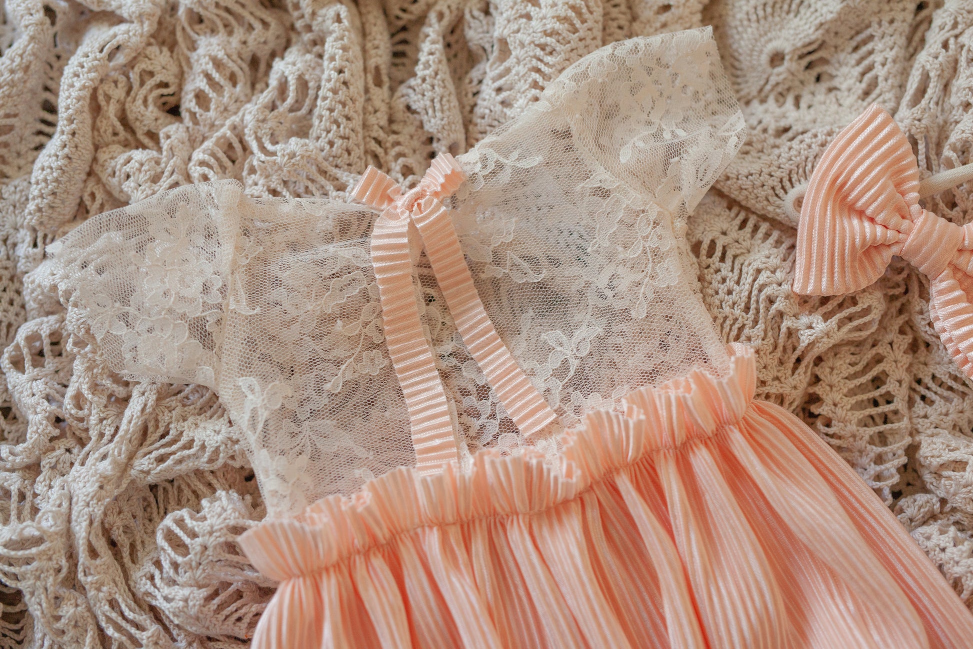 A sweet peach newborn romper, with a lace top and a ruffled pleated skirt. Please note that the lace is quite sheer, which would make this piece ideal for bum-up poses.