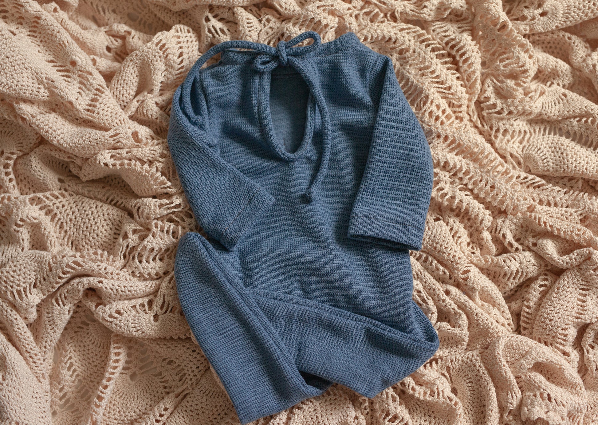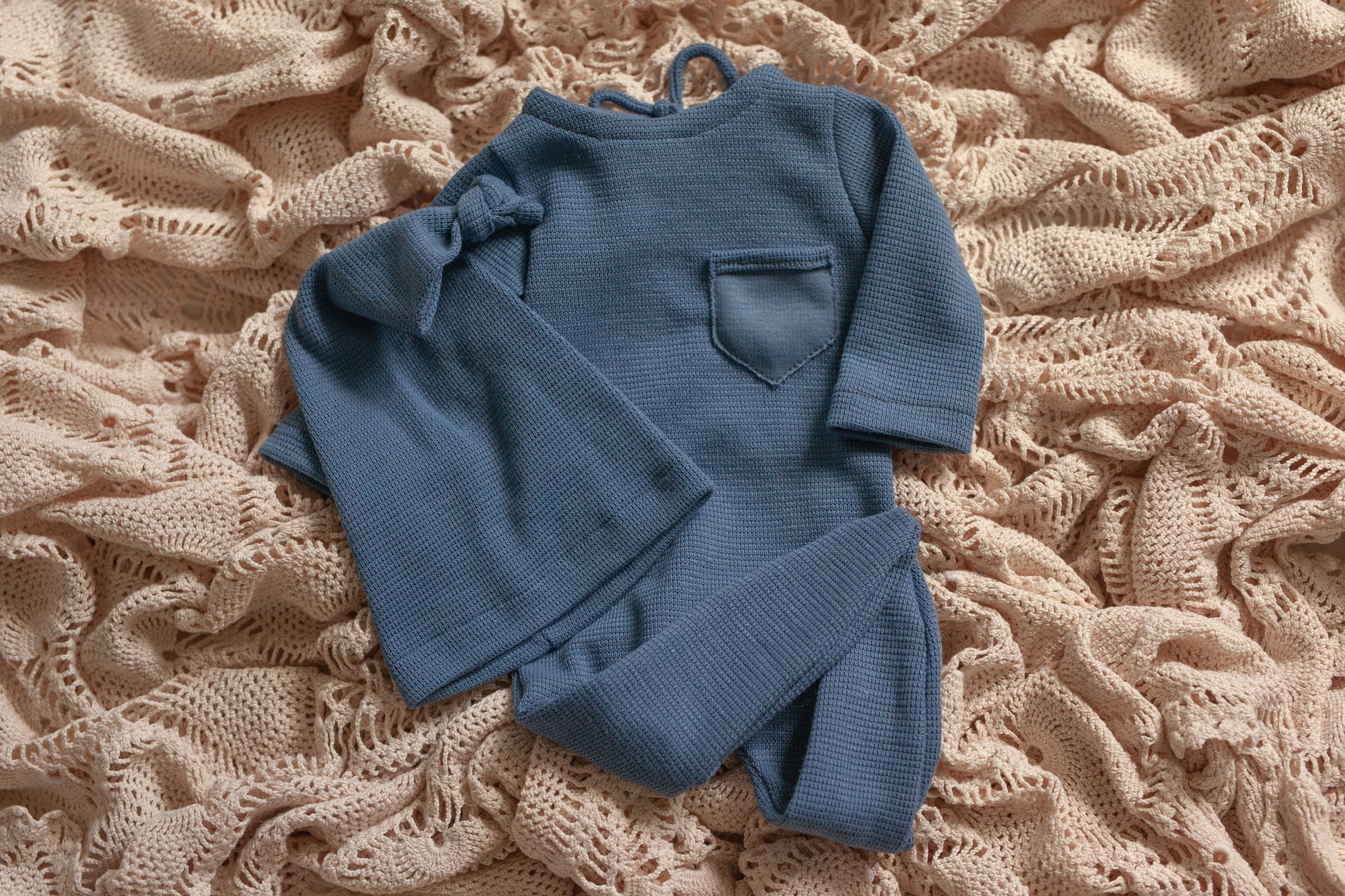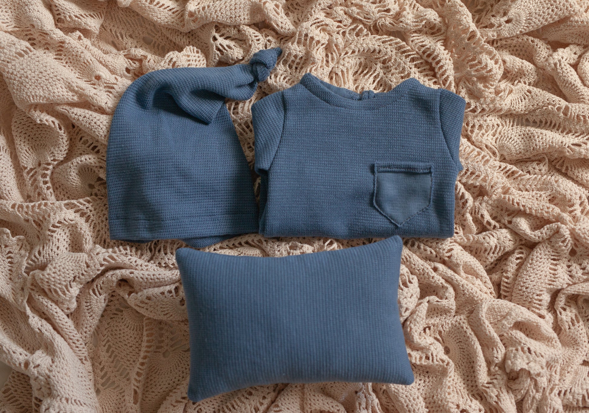 Textured blue set, with options that include a newborn footed sleeper with pocket on the front, a newborn sized knotted sleepy cap and a matching pillow.